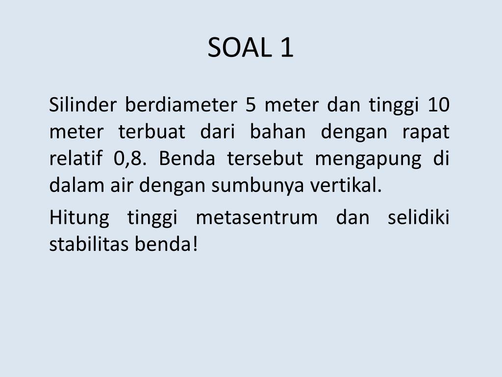 SOAL 1 Silinder berdiameter 5 meter dan tinggi 10 meter terbuat dari bahan dengan rapat relatif 0,8. Benda tersebut mengapung di dalam air dengan sumbunya vertikal. Hitung tinggi metasentrum dan selidiki stabilitas benda!