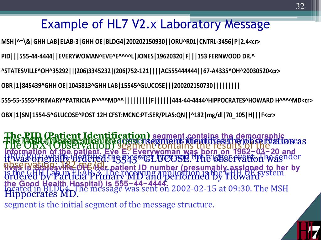Example of HL7 V2.x Laboratory Message The MSH (Message Header) segment contains the message type, in this case, ORU^R01, which identifies the message type and the trigger event. The sender is the GHH Lab in ELAB-3. The receiving application is the GHHOE system located in BLDG4. The message was sent on 2002-02-15 at 09:30. The MSH segment is the initial segment of the message structure. The PID (Patient Identification) segment contains the demographic information of the patient. Eve E. Everywoman was born on 1962-03-20 and lives in Statesville OH. Her patient ID number (presumably assigned to her by the Good Health Hospital) is 555-44-4444. The OBR (Observation Request) segment identifies the observation as it was orignally ordered: 15545^GLUCOSE. The observation was ordered by Particia Primary MD and performed by Howard Hippocrates MD. The OBX (Observation) segment contains the results of the observation: 182 mg/dl.
