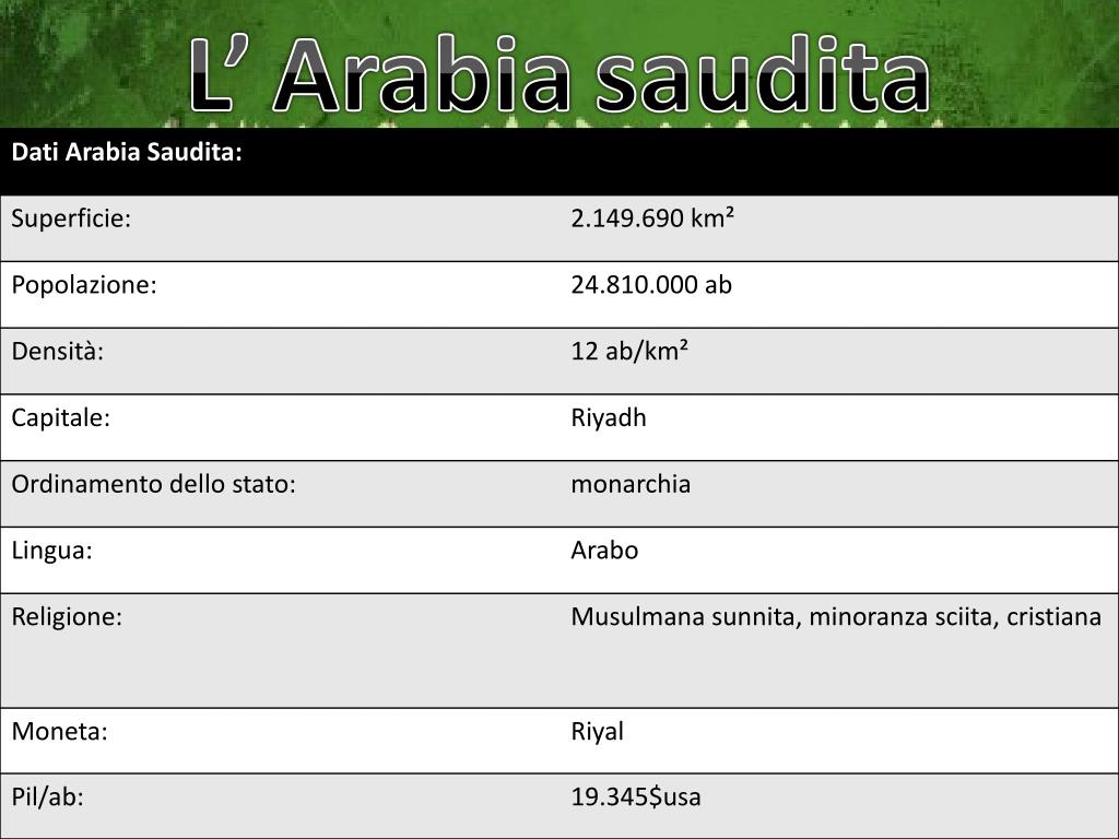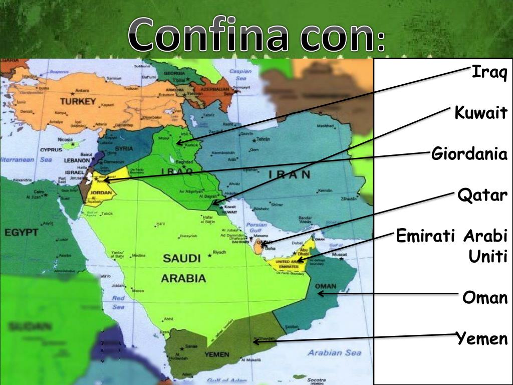 L’ Arabia saudita. Confina con :. Iraq Kuwait Giordania Qatar Emirati Arabi Uniti Oman Yemen. Si affaccia sul:. Mar Nero G olfo Persico. Il territorio :. È attraversata dal tropico del cancro ed è coperta da deserti: Nafrud , Rub ’ al- Khali .