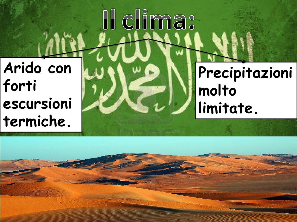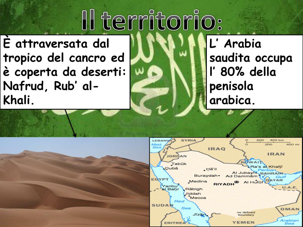 Ilterritorio: È attraversata dal tropico del cancro ed è coperta da deserti: Nafrud, Rub’ al- Khali. L’ Arabia saudita occupa l’ 80% della penisola arabica.