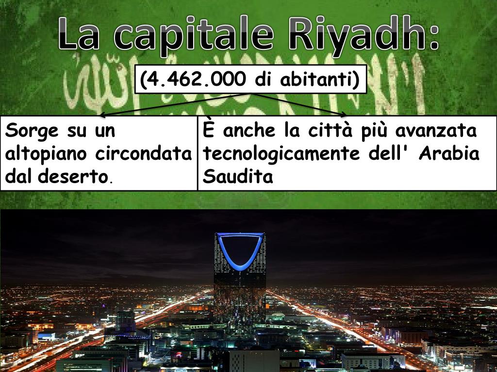 La capitale Riyadh: (4.462.000 di abitanti) Sorge su un altopiano circondatadaldeserto. È anche la città più avanzata tecnologicamente dell' Arabia Saudita