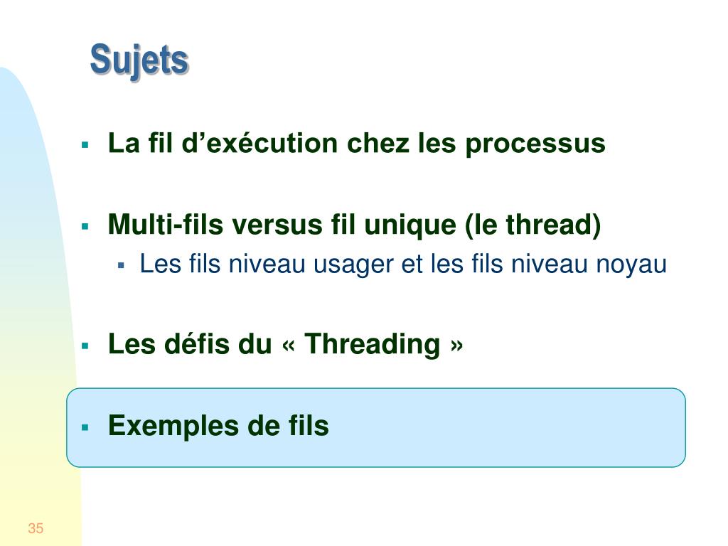 Sujets • La fil d’exécution chez les processus • Multi-fils versus fil unique (le thread) • Les fils niveau usager et les fils niveau noyau • Les défis du « Threading » • Exemples de fils