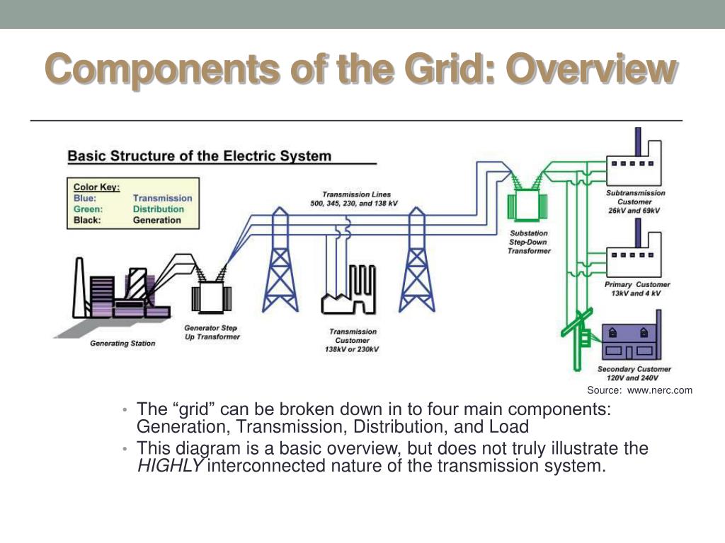 Source: www.nerc.com Components of the Grid: Overview • The “grid” can be broken down in to four main components: Generation, Transmission, Distribution, and Load • This diagram is a basic overview, but does not truly illustrate the HIGHLY interconnected nature of the transmission system.