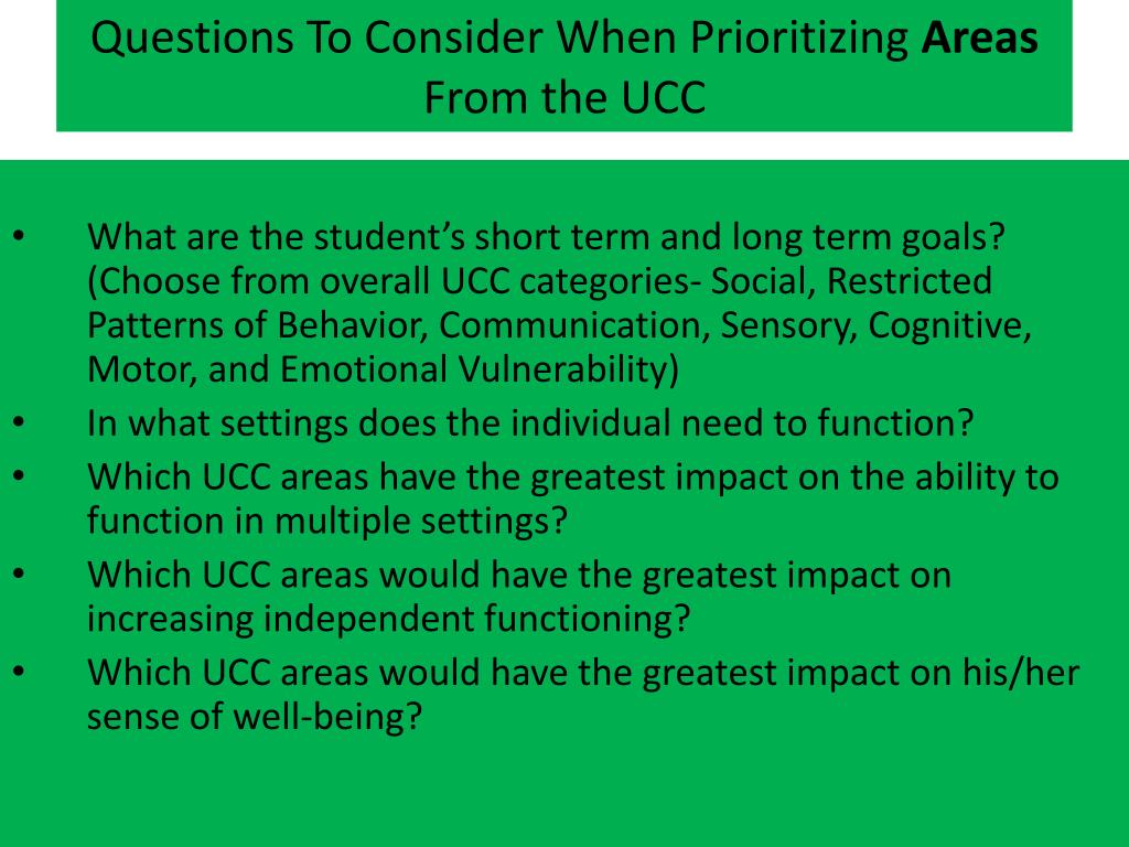 Questions To Consider When Prioritizing Areas From the UCC • What are the student’s short term and long term goals? (Choose from overall UCC categories- Social, Restricted Patterns of Behavior, Communication, Sensory, Cognitive, Motor, and Emotional Vulnerability) • In what settings does the individual need to function? • Which UCC areas have the greatest impact on the ability to function in multiple settings? • Which UCC areas would have the greatest impact on increasing independent functioning? • Which UCC areas would have the greatest impact on his/her sense of well-being?