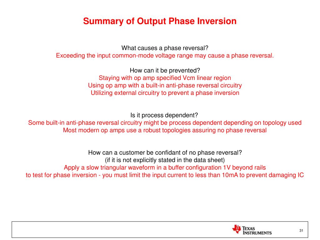 Summary of Output Phase Inversion What causes a phase reversal? Exceeding the input common-mode voltage range may cause a phase reversal. How can it be prevented? Staying with op amp specified Vcm linear region Using op amp with a built-in anti-phase reversal circuitry Utilizing external circuitry to prevent a phase inversion Is it process dependent? Some built-in anti-phase reversal circuitry might be process dependent depending on topology used Most modern op amps use a robust topologies assuring no phase reversal How can a customer be confidant of no phase reversal? (if it is not explicitly stated in the data sheet) Apply a slow triangular waveform in a buffer configuration 1V beyond rails to test for phase inversion - you must limit the input current to less than 10mA to prevent damaging IC