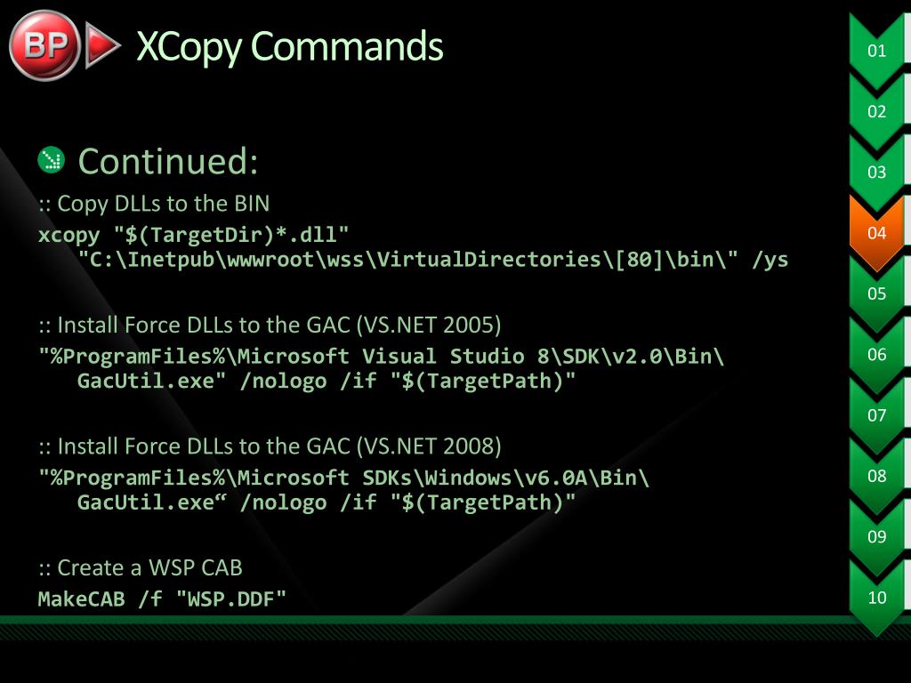 XCopy Commands • Continued: :: Copy DLLs to the BIN xcopy "$(TargetDir)*.dll" "C:\Inetpub\wwwroot\wss\VirtualDirectories\[80]\bin\" /ys :: Install Force DLLs to the GAC (VS.NET 2005) "%ProgramFiles%\Microsoft Visual Studio 8\SDK\v2.0\Bin\GacUtil.exe" /nologo /if "$(TargetPath)" :: Install Force DLLs to the GAC (VS.NET 2008) "%ProgramFiles%\Microsoft SDKs\Windows\v6.0A\Bin\GacUtil.exe“ /nologo /if "$(TargetPath)" :: Create a WSP CAB MakeCAB /f "WSP.DDF"