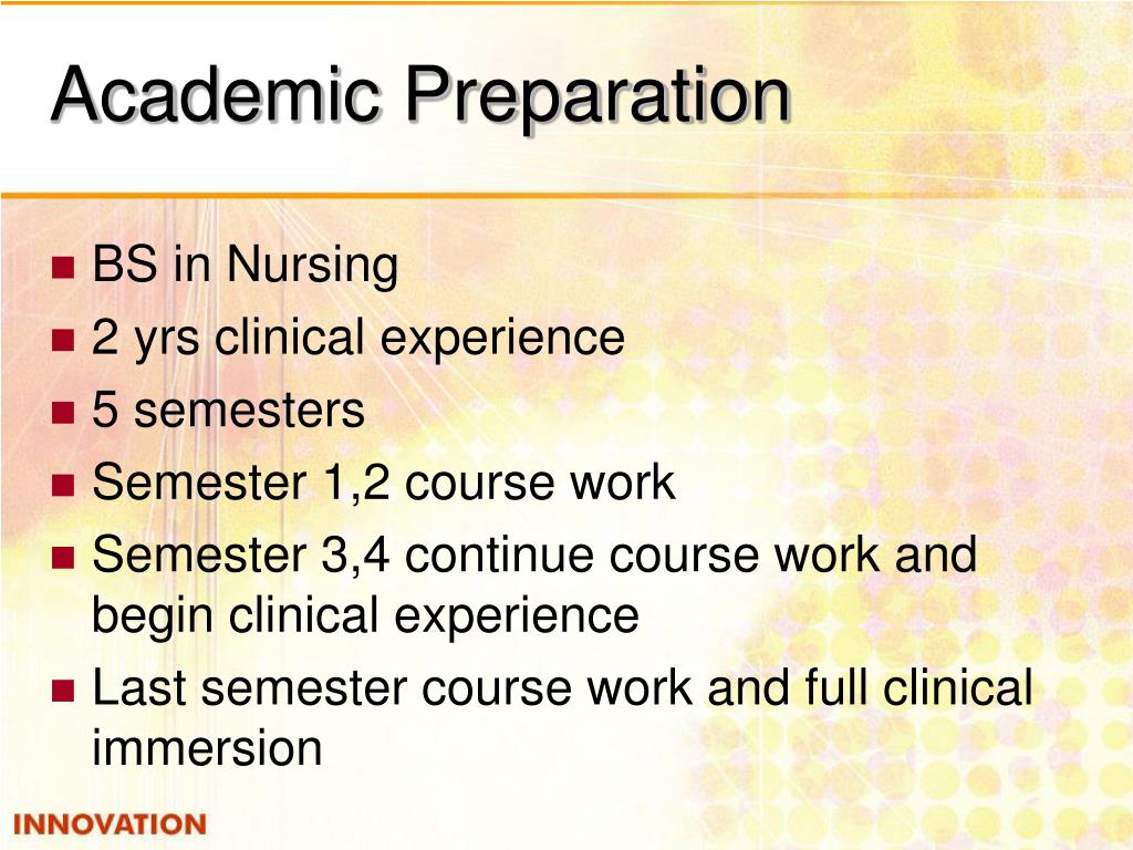Academic Preparation • BS in Nursing • 2 yrs clinical experience • 5 semesters • Semester 1,2 course work • Semester 3,4 continue course work and begin clinical experience • Last semester course work and full clinical immersion