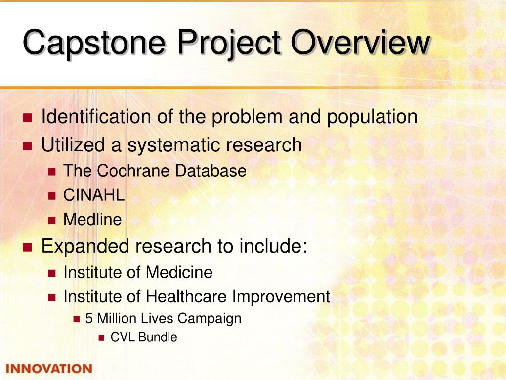 Capstone Project Overview • Identification of the problem and population • Utilized a systematic research • The Cochrane Database • CINAHL • Medline • Expanded research to include: • Institute of Medicine • Institute of Healthcare Improvement • 5 Million Lives Campaign • CVL Bundle