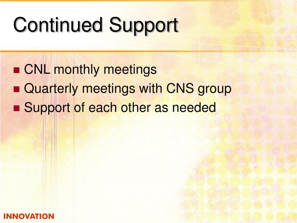 Continued Support • CNL monthly meetings • Quarterly meetings with CNS group • Support of each other as needed