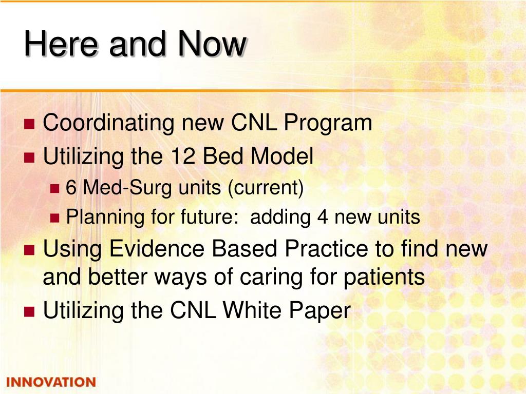Here and Now • Coordinating new CNL Program • Utilizing the 12 Bed Model • 6 Med-Surg units (current) • Planning for future: adding 4 new units • Using Evidence Based Practice to find new and better ways of caring for patients • Utilizing the CNL White Paper