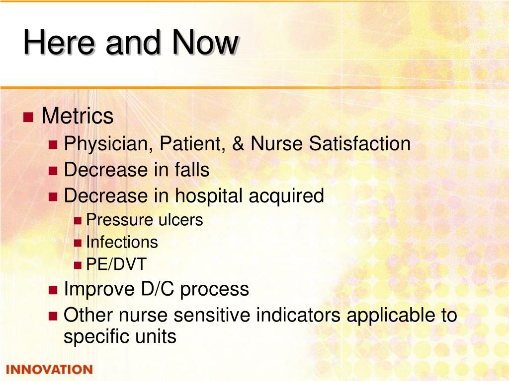 Here and Now • Metrics • Physician, Patient, & Nurse Satisfaction • Decrease in falls • Decrease in hospital acquired • Pressure ulcers • Infections • PE/DVT • Improve D/C process • Other nurse sensitive indicators applicable to specific units