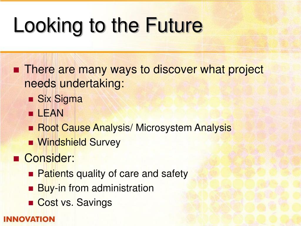 Looking to the Future • There are many ways to discover what project needs undertaking: • Six Sigma • LEAN • Root Cause Analysis/ Microsystem Analysis • Windshield Survey • Consider: • Patients quality of care and safety • Buy-in from administration • Cost vs. Savings