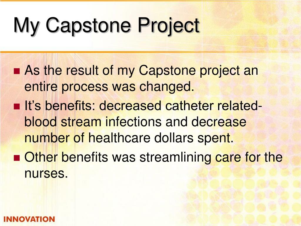 My Capstone Project • As the result of my Capstone project an entire process was changed. • It’s benefits: decreased catheter related-blood stream infections and decrease number of healthcare dollars spent. • Other benefits was streamlining care for the nurses.