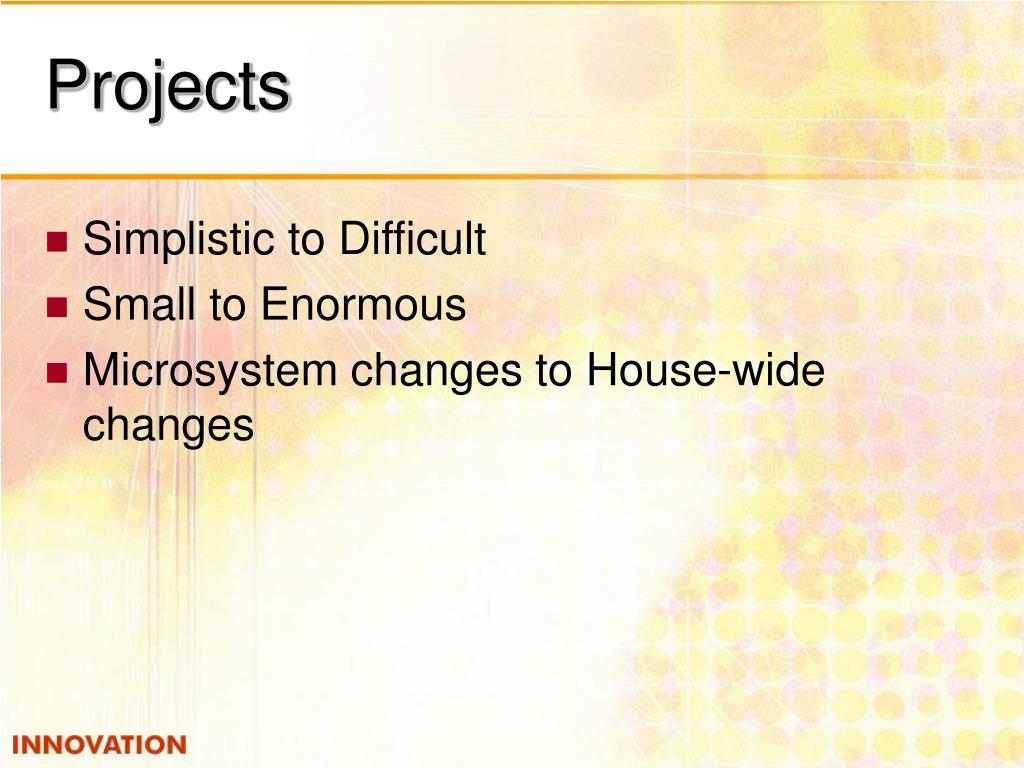 Projects • Simplistic to Difficult • Small to Enormous • Microsystem changes to House-wide changes