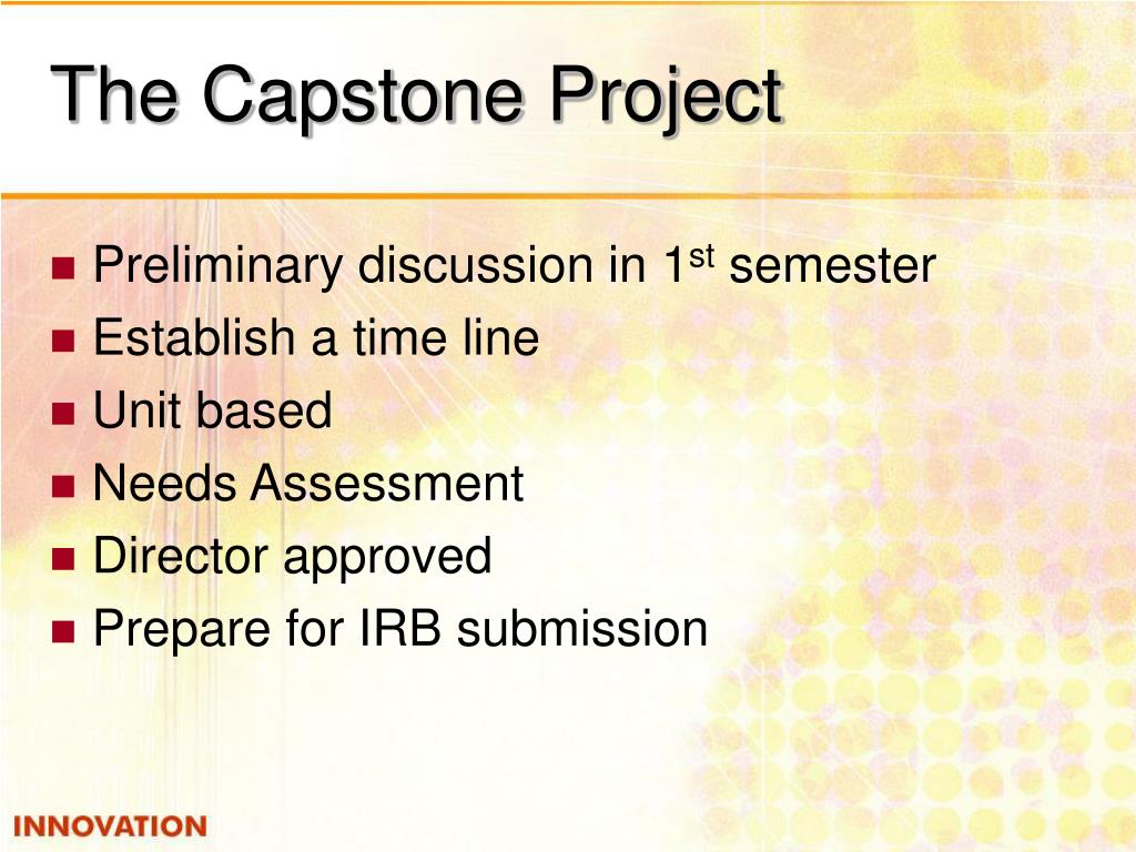 The Capstone Project • Preliminary discussion in 1st semester • Establish a time line • Unit based • Needs Assessment • Director approved • Prepare for IRB submission