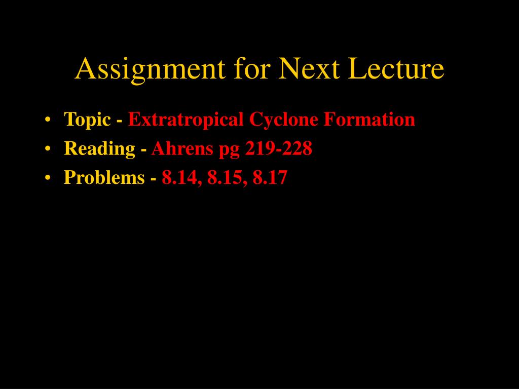 Assignment for Next Lecture • Topic -Extratropical Cyclone Formation • Reading -Ahrens pg 219-228 • Problems -8.14, 8.15, 8.17