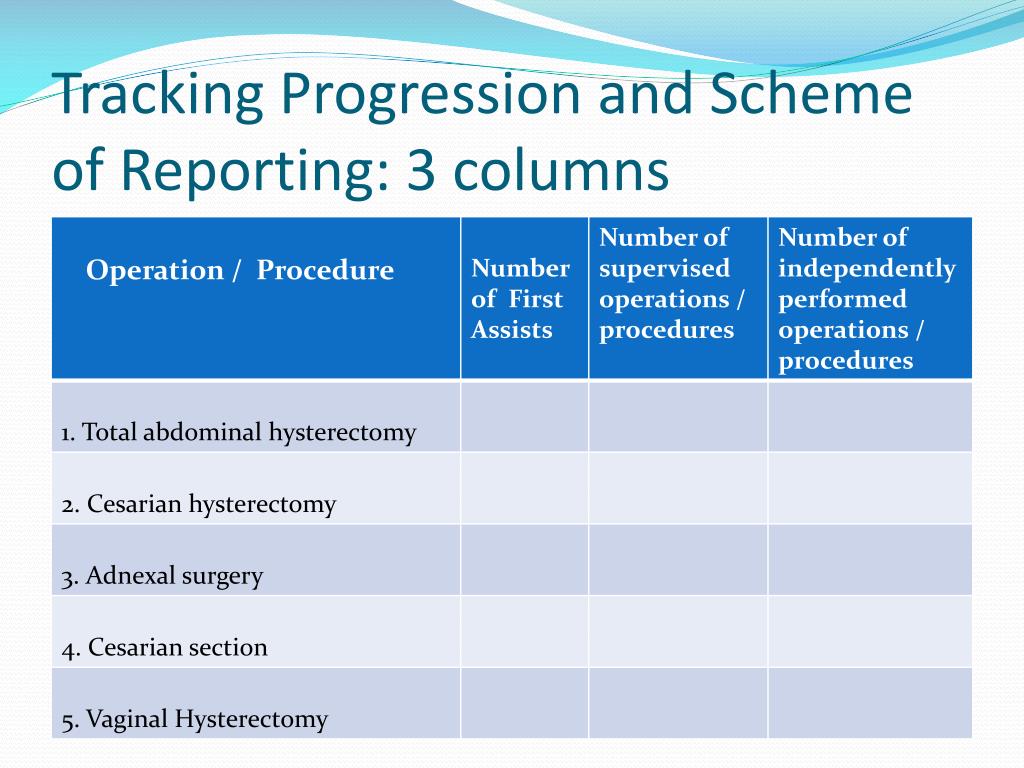 Objectives for the session: 1. Discuss the educational principles behind the acquisition and development of psychomotor skills 2. Examine required number of operations for OB-GYN residents 3. Discuss research studies relevant to training and how to utilize research data 4. Formulate a system of determining and validating requirements in number of operations in residency training (both for graduation and for certification) 5. Formulate a system of documentation and reporting