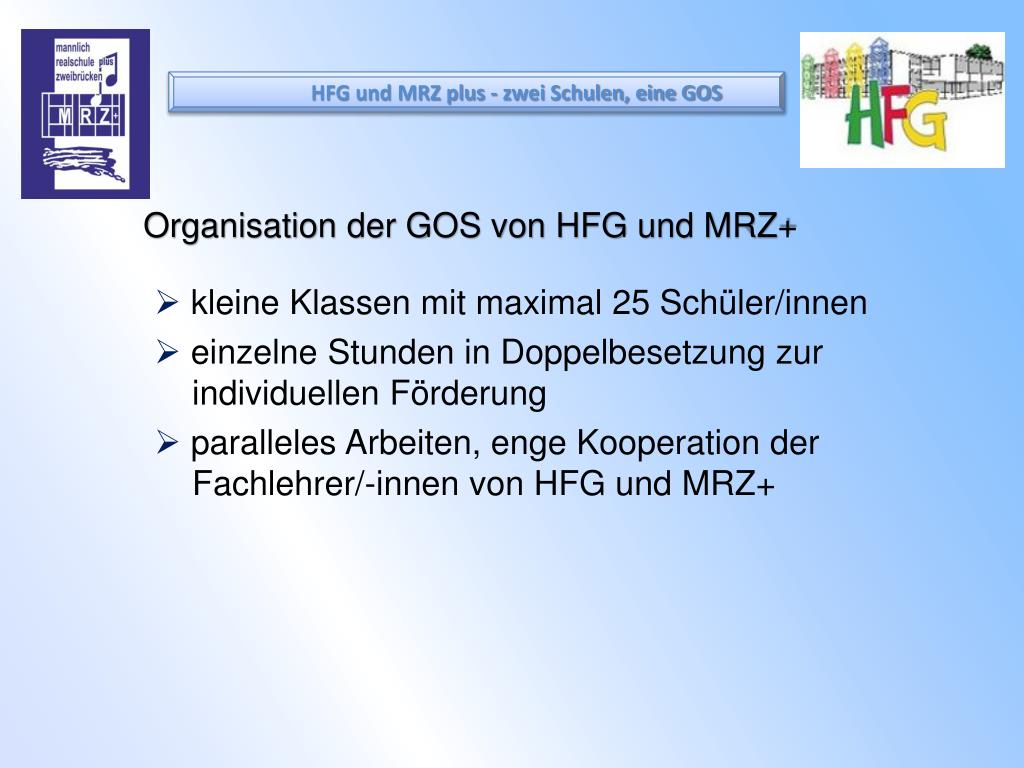 HFG und MRZ plus - zwei Schulen, eine GOS Organisation der GOS von HFG und MRZ+ • kleine Klassen mit maximal 25 Schüler/innen • einzelne Stunden in Doppelbesetzung zur • individuellen Förderung • paralleles Arbeiten, enge Kooperation der • Fachlehrer/-innen von HFG und MRZ+