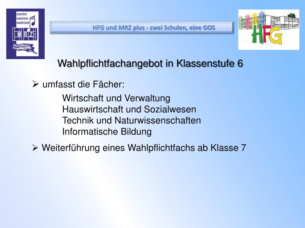 HFG und MRZ plus - zwei Schulen, eine GOS Wahlpflichtfachangebot in Klassenstufe 6 • umfasst die Fächer: • Wirtschaft und Verwaltung • Hauswirtschaft und Sozialwesen • Technik und Naturwissenschaften • Informatische Bildung • Weiterführung eines Wahlpflichtfachs ab Klasse 7