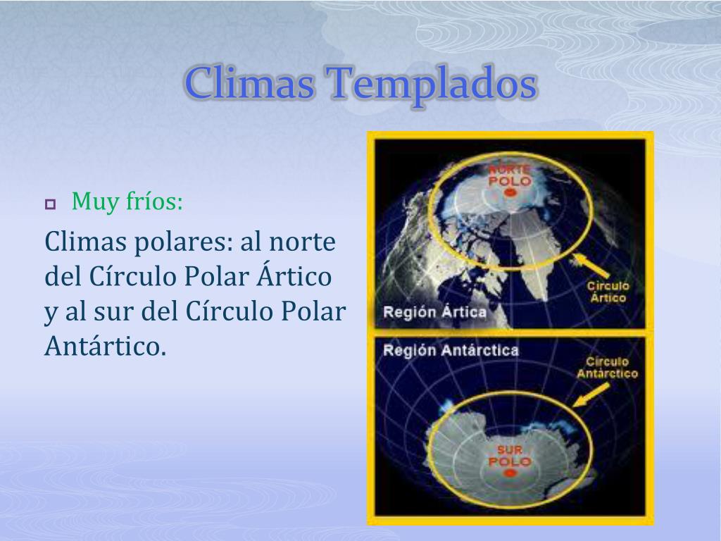 Climas Templados • Muy fríos: Climas polares: al norte del Círculo Polar Ártico y al sur del Círculo Polar Antártico.