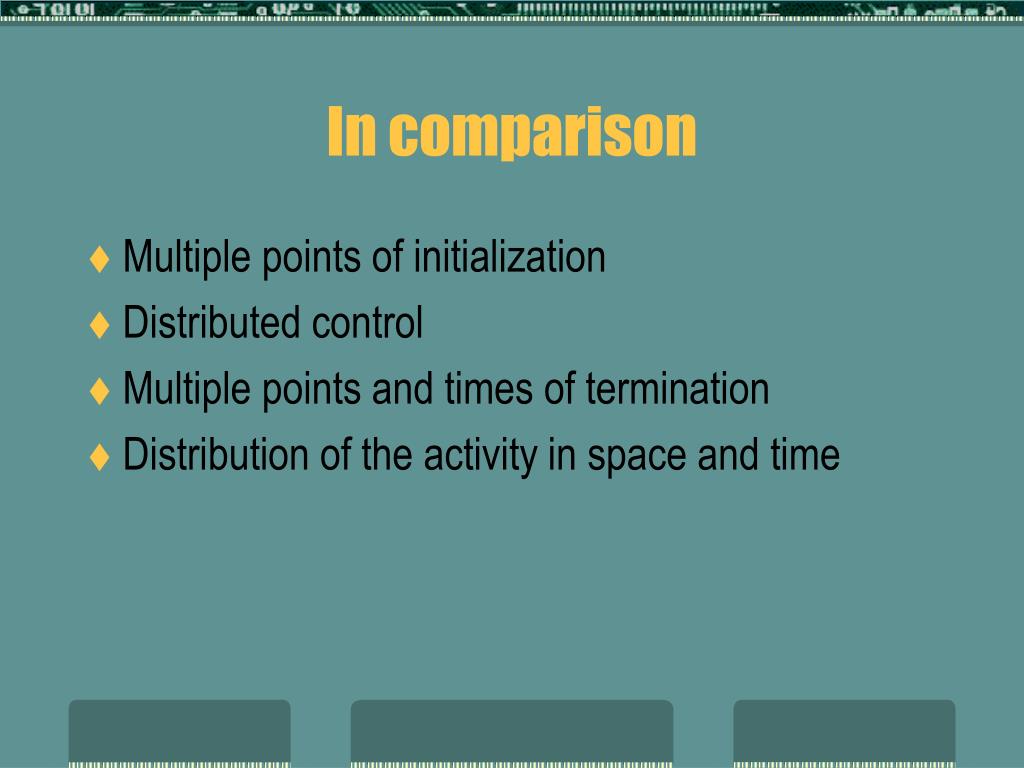 In comparison • Multiple points of initialization • Distributed control • Multiple points and times of termination • Distribution of the activity in space and time