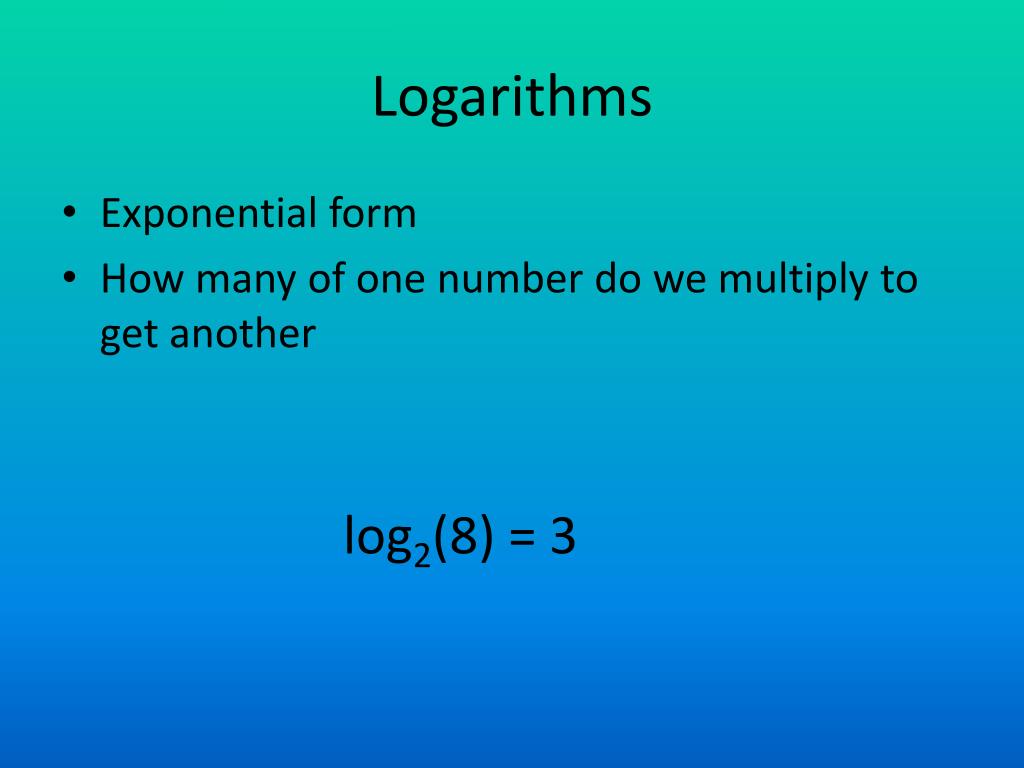Logarithms • Exponential form • How many of one number do we multiply to get another log2(8) = 3