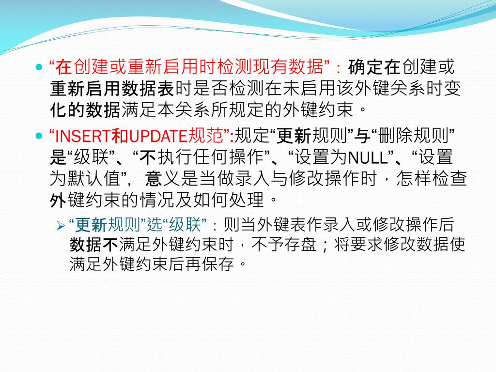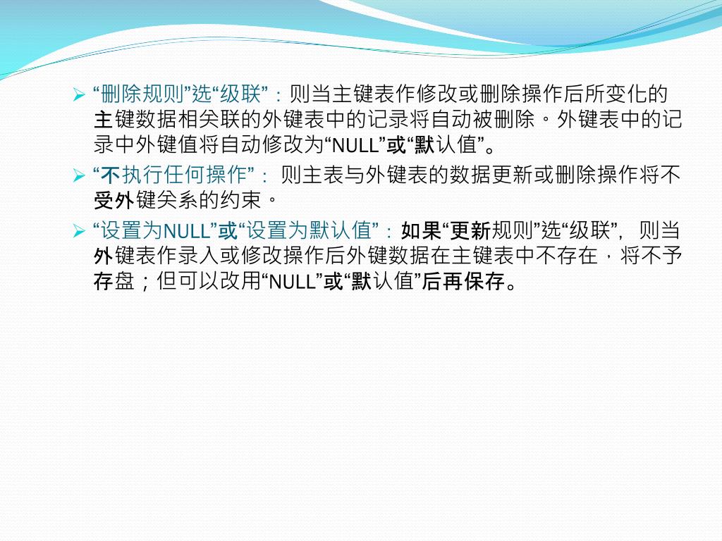 “删除规则”选“级联”:则当主键表作修改或删除操作后所变化的主键数据相关联的外键表中的记录将自动被删除。外键表中的记录中外键值将自动修改为“NULL”或“默认值”。“删除规则”选“级联”:则当主键表作修改或删除操作后所变化的主键数据相关联的外键表中的记录将自动被删除。外键表中的记录中外键值将自动修改为“NULL”或“默认值”。 • “不执行任何操作”: 则主表与外键表的数据更新或删除操作将不受外键关系的约束。 • “设置为NULL”或“设置为默认值”:如果“更新规则”选“级联”,则当外键表作录入或修改操作后外键数据在主键表中不存在,将不予存盘;但可以改用“NULL”或“默认值”后再保存。