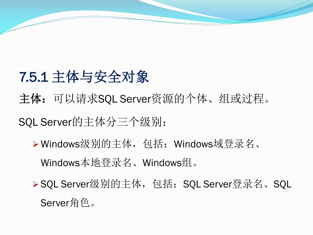 7.5.1 主体与安全对象 主体:可以请求SQL Server资源的个体、组或过程。 SQL Server的主体分三个级别: • Windows级别的主体,包括:Windows域登录名、Windows本地登录名、Windows组。 • SQL Server级别的主体,包括:SQL Server登录名、SQL Server角色。