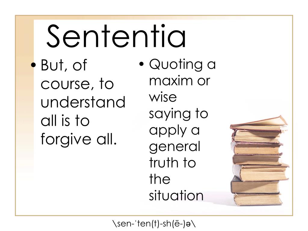 Sententia • But, of course, to understand all is to forgive all. • Quoting a maxim or wise saying to apply a general truth to the situation \sen-ˈten(t)-sh(ē-)ə\