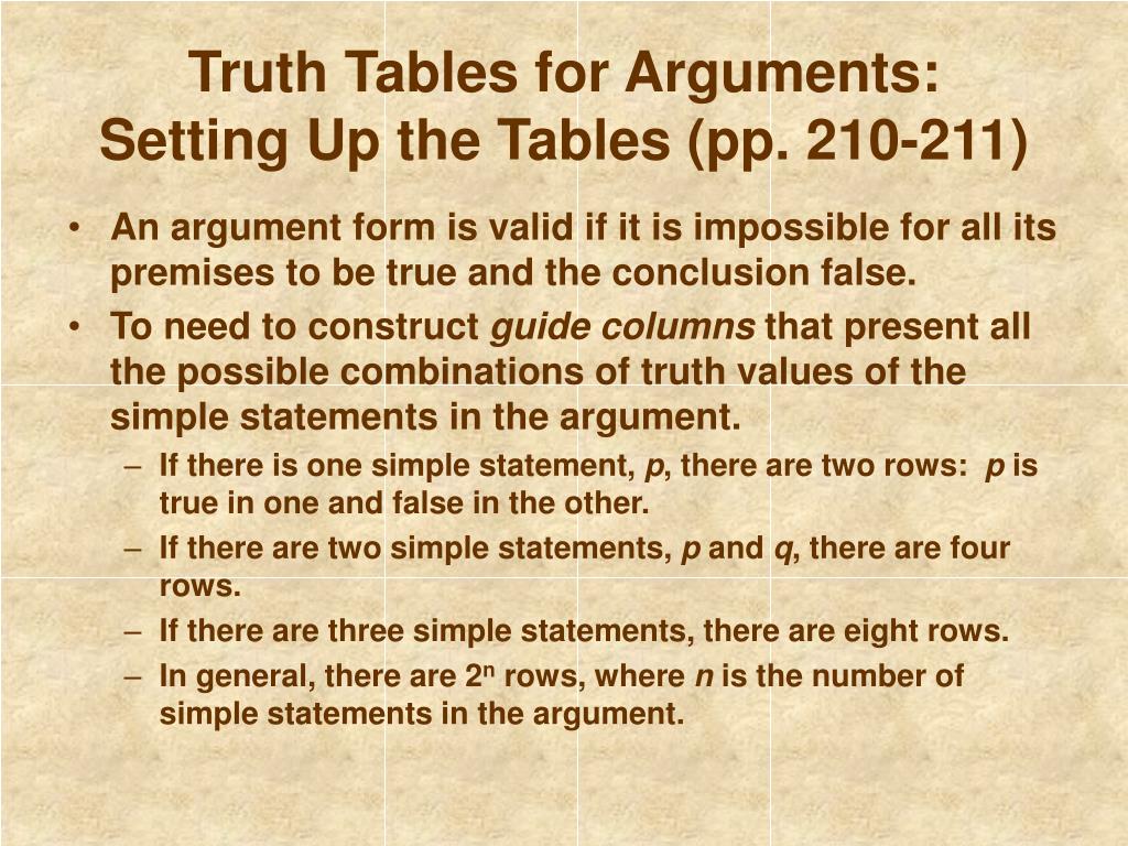 Truth Tables for Arguments: Setting Up the Tables (pp. 210-211) • An argument form is valid if it is impossible for all its premises to be true and the conclusion false. • To need to construct guide columns that present all the possible combinations of truth values of the simple statements in the argument. • If there is one simple statement, p, there are two rows: p is true in one and false in the other. • If there are two simple statements, p and q, there are four rows. • If there are three simple statements, there are eight rows. • In general, there are 2n rows, where n is the number of simple statements in the argument.