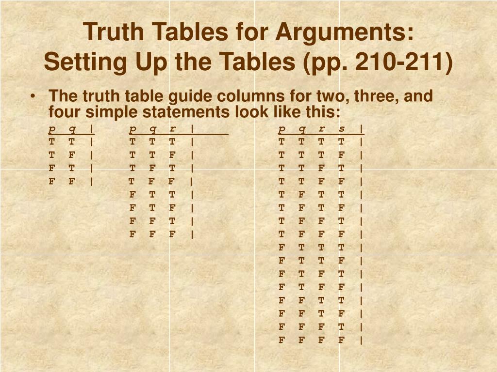 Chapter 21: Truth Tables. What Truth Tables Do (p. 209). Truth tables provide a systematic way to examine all possible combinations of truth values for a statement or for the statements in an argument. Truth tables allow you to: determine whether an argument form is valid.