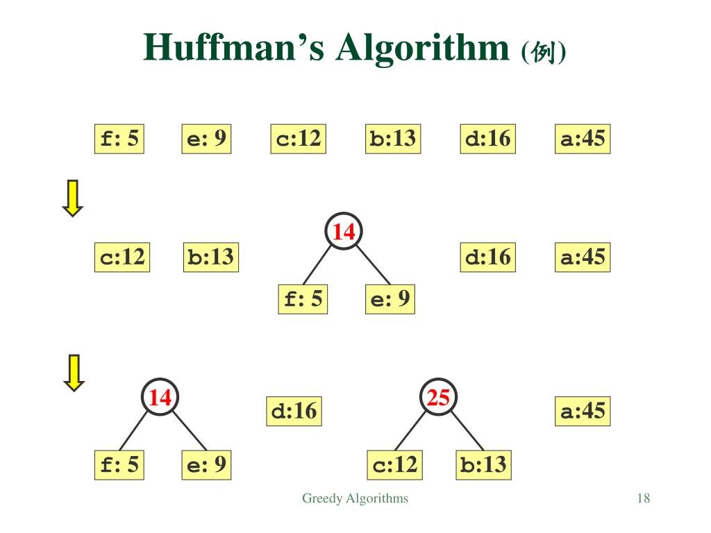 Huffman’s Algorithm (例) 14 c:12 b:13 d:16 a:45 f: 5 e: 9 14 25 d:16 a:45 f: 5 e: 9 c:12 b:13 f: 5 e: 9 c:12 b:13 d:16 a:45 Greedy Algorithms