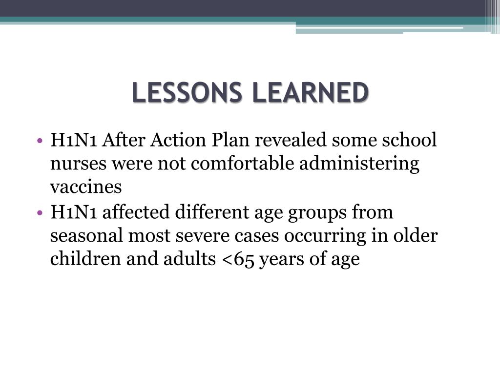 LESSONS LEARNED • H1N1 After Action Plan revealed some school nurses were not comfortable administering vaccines • H1N1 affected different age groups from seasonal most severe cases occurring in older children and adults <65 years of age