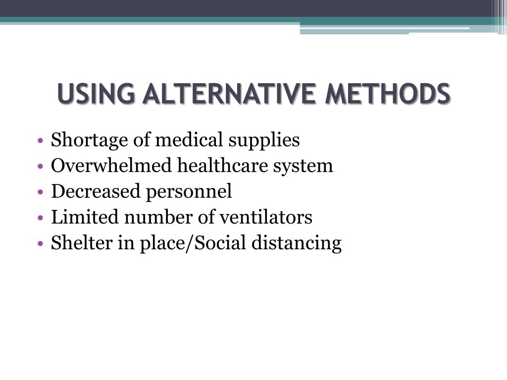 USING ALTERNATIVE METHODS • Shortage of medical supplies • Overwhelmed healthcare system • Decreased personnel • Limited number of ventilators • Shelter in place/Social distancing