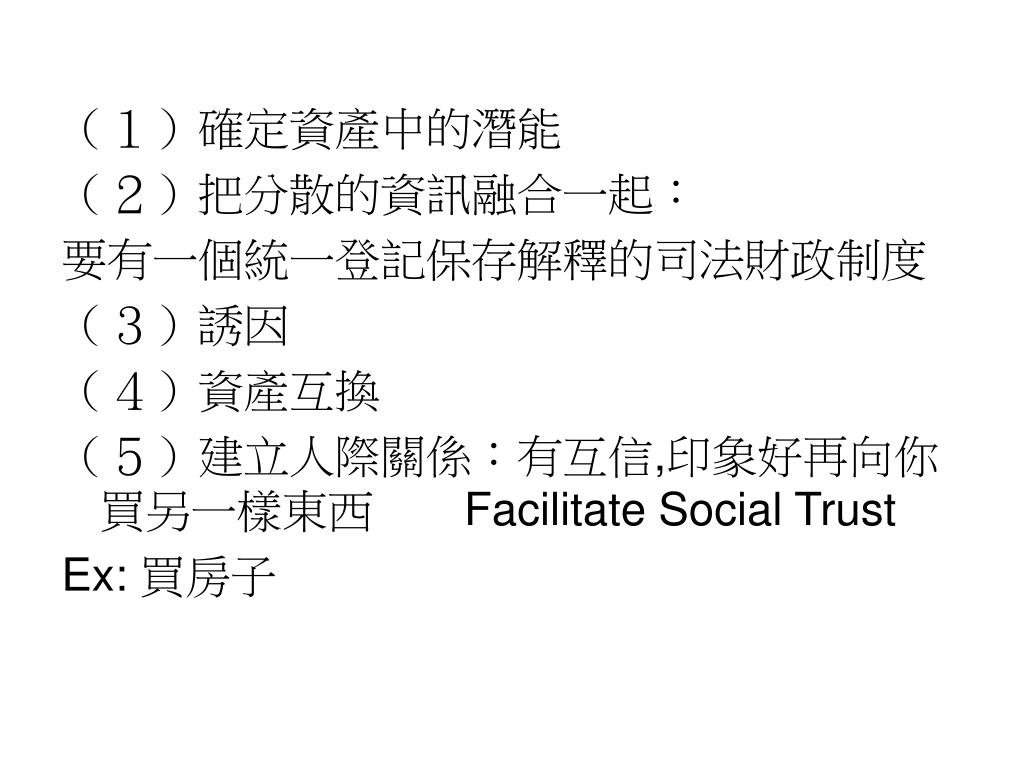 (1)確定資產中的潛能 (2)把分散的資訊融合一起: 要有一個統一登記保存解釋的司法財政制度 (3)誘因 (4)資產互換 (5)建立人際關係:有互信,印象好再向你買另一樣東西 Facilitate Social Trust Ex: 買房子