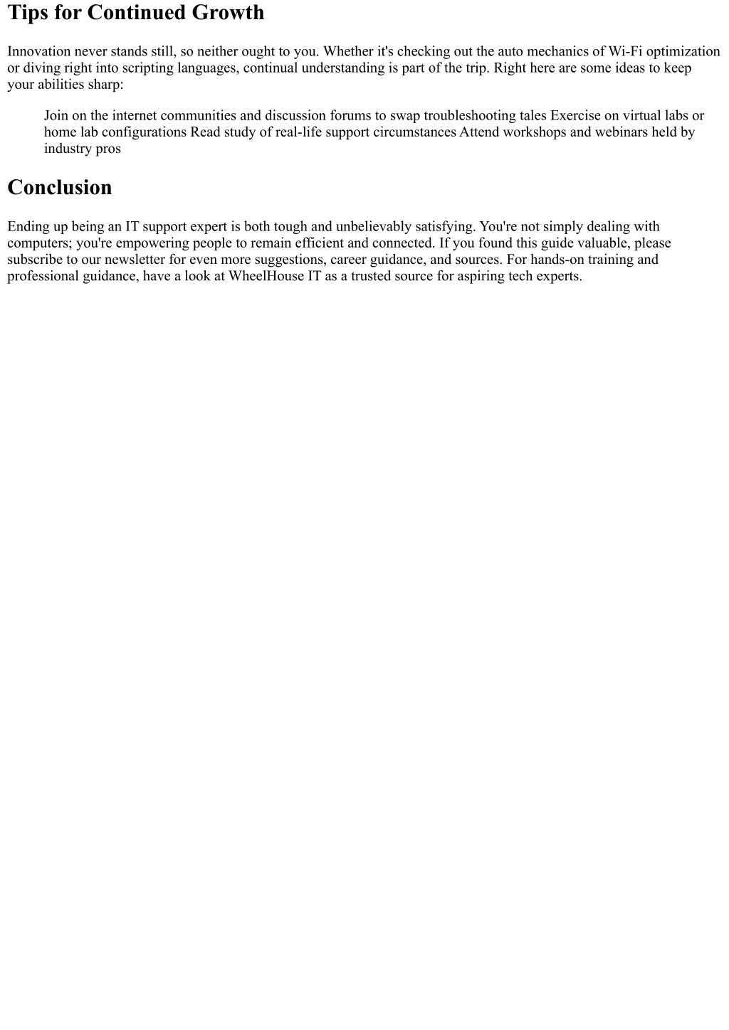Tips for Continued Growth Innovation never stands still, so neither ought to you. Whether it's checking out the auto mechanics of Wi-Fi optimization or diving right into scripting languages, continual understanding is part of the trip. Right here are some ideas to keep your abilities sharp: Join on the internet communities and discussion forums to swap troubleshooting tales Exercise on virtual labs or home lab configurations Read study of real-life support circumstances Attend workshops and webinars held by industry pros Conclusion Ending up being an IT support expert is both tough and unbelievably satisfying. You're not simply dealing with computers; you're empowering people to remain efficient and connected. If you found this guide valuable, please subscribe to our newsletter for even more suggestions, career guidance, and sources. For hands-on training and professional guidance, have a look at WheelHouse IT as a trusted source for aspiring tech experts.