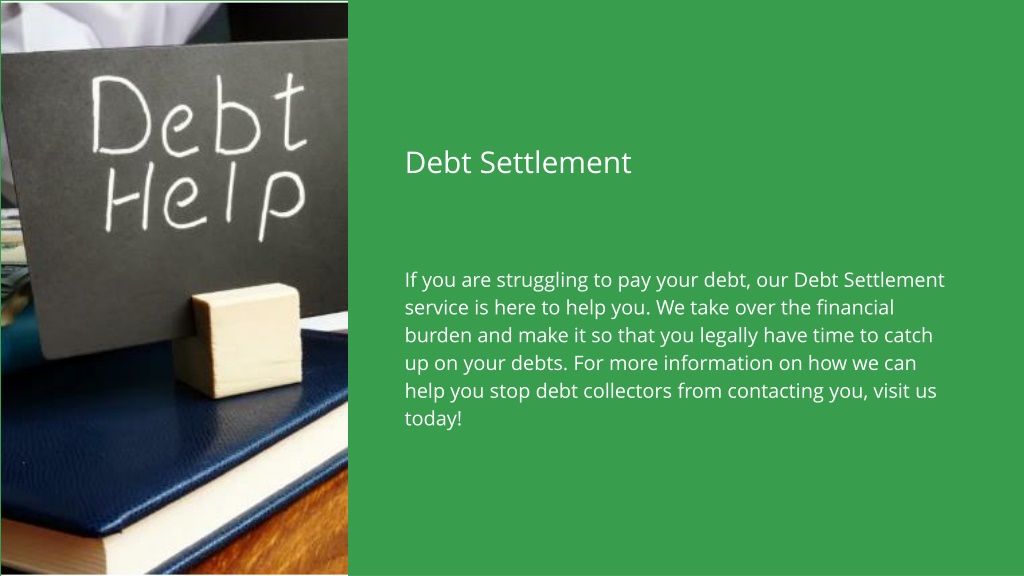Debt Settlement If you are struggling to pay your debt, our Debt Settlement service is here to help you. We take over the financial burden and make it so that you legally have time to catch up on your debts. For more information on how we can help you stop debt collectors from contacting you, visit us today!