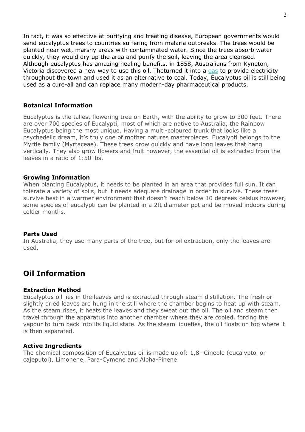 2 In fact, it was so effective at purifying and treating disease, European governments would send eucalyptus trees to countries suffering from malaria outbreaks. The trees would be planted near wet, marshy areas with contaminated water. Since the trees absorb water quickly, they would dry up the area and purify the soil, leaving the area cleansed. Although eucalyptus has amazing healing benefits, in 1858, Australians from Kyneton, Victoria discovered a new way to use this oil. Theturned it into a gas to provide electricity throughout the town and used it as an alternative to coal. Today, Eucalyptus oil is still being used as a cure-all and can replace many modern-day pharmaceutical products. Botanical Information Eucalyptus is the tallest flowering tree on Earth, with the ability to grow to 300 feet. There are over 700 species of Eucalypti, most of which are native to Australia, the Rainbow Eucalyptus being the most unique. Having a multi-coloured trunk that looks like a psychedelic dream, it’s truly one of mother natures masterpieces. Eucalypti belongs to the Myrtle family (Myrtaceae). These trees grow quickly and have long leaves that hang vertically. They also grow flowers and fruit however, the essential oil is extracted from the leaves in a ratio of 1:50 lbs. Growing Information When planting Eucalyptus, it needs to be planted in an area that provides full sun. It can tolerate a variety of soils, but it needs adequate drainage in order to survive. These trees survive best in a warmer environment that doesn’t reach below 10 degrees celsius however, some species of eucalypti can be planted in a 2ft diameter pot and be moved indoors during colder months. Parts Used In Australia, they use many parts of the tree, but for oil extraction, only the leaves are used. Oil Information Extraction Method Eucalyptus oil lies in the leaves and is extracted through steam distillation. The fresh or slightly dried leaves are hung in the still where the chamber begins to heat up with steam. As the steam rises, it heats the leaves and they sweat out the oil. The oil and steam then travel through the apparatus into another chamber where they are cooled, forcing the vapour to turn back into its liquid state. As the steam liquefies, the oil floats on top where it is then separated. Active Ingredients The chemical composition of Eucalyptus oil is made up of: 1,8- Cineole (eucalyptol or cajeputol), Limonene, Para-Cymene and Alpha-Pinene.