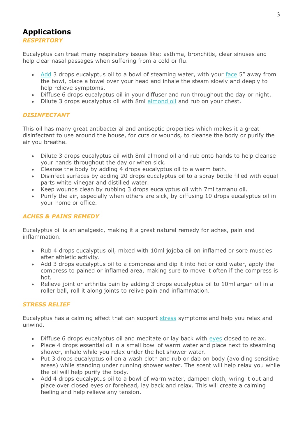 3 Applications RESPIRTORY Eucalyptus can treat many respiratory issues like; asthma, bronchitis, clear sinuses and help clear nasal passages when suffering from a cold or flu. Add 3 drops eucalyptus oil to a bowl of steaming water, with your face 5” away from the bowl, place a towel over your head and inhale the steam slowly and deeply to help relieve symptoms. Diffuse 6 drops eucalyptus oil in your diffuser and run throughout the day or night. Dilute 3 drops eucalyptus oil with 8ml almond oil and rub on your chest. • • • DISINFECTANT This oil has many great antibacterial and antiseptic properties which makes it a great disinfectant to use around the house, for cuts or wounds, to cleanse the body or purify the air you breathe. Dilute 3 drops eucalyptus oil with 8ml almond oil and rub onto hands to help cleanse your hands throughout the day or when sick. Cleanse the body by adding 4 drops eucalyptus oil to a warm bath. Disinfect surfaces by adding 20 drops eucalyptus oil to a spray bottle filled with equal parts white vinegar and distilled water. Keep wounds clean by rubbing 3 drops eucalyptus oil with 7ml tamanu oil. Purify the air, especially when others are sick, by diffusing 10 drops eucalyptus oil in your home or office. • • • • • ACHES & PAINS REMEDY Eucalyptus oil is an analgesic, making it a great natural remedy for aches, pain and inflammation. Rub 4 drops eucalyptus oil, mixed with 10ml jojoba oil on inflamed or sore muscles after athletic activity. Add 3 drops eucalyptus oil to a compress and dip it into hot or cold water, apply the compress to pained or inflamed area, making sure to move it often if the compress is hot. Relieve joint or arthritis pain by adding 3 drops eucalyptus oil to 10ml argan oil in a roller ball, roll it along joints to relive pain and inflammation. • • • STRESS RELIEF Eucalyptus has a calming effect that can support stress symptoms and help you relax and unwind. Diffuse 6 drops eucalyptus oil and meditate or lay back with eyes closed to relax. Place 4 drops essential oil in a small bowl of warm water and place next to steaming shower, inhale while you relax under the hot shower water. Put 3 drops eucalyptus oil on a wash cloth and rub or dab on body (avoiding sensitive areas) while standing under running shower water. The scent will help relax you while the oil will help purify the body. Add 4 drops eucalyptus oil to a bowl of warm water, dampen cloth, wring it out and place over closed eyes or forehead, lay back and relax. This will create a calming feeling and help relieve any tension. • • • •