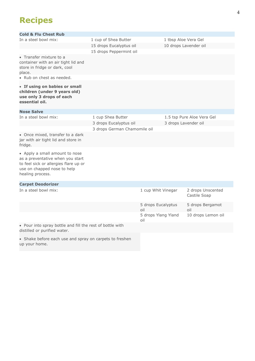 4 Recipes Cold & Flu Chest Rub In a steel bowl mix: 1 cup of Shea Butter 15 drops Eucalyptus oil 15 drops Peppermint oil 1 tbsp Aloe Vera Gel 10 drops Lavender oil • Transfer mixture to a container with an air tight lid and store in fridge or dark, cool place. • Rub on chest as needed. •If using on babies or small children (under 9 years old) use only 3 drops of each essential oil. Nose Salve In a steel bowl mix: 1 cup Shea Butter 3 drops Eucalyptus oil 3 drops German Chamomile oil 1.5 tsp Pure Aloe Vera Gel 3 drops Lavender oil • Once mixed, transfer to a dark jar with air tight lid and store in fridge. • Apply a small amount to nose as a preventative when you start to feel sick or allergies flare up or use on chapped nose to help healing process. Carpet Deodorizer In a steel bowl mix: 1 cup Whit Vinegar 2 drops Unscented Castile Soap 5 drops Eucalyptus oil 5 drops Ylang Yland oil 5 drops Bergamot oil 10 drops Lemon oil • Pour into spray bottle and fill the rest of bottle with distilled or purified water. • Shake before each use and spray on carpets to freshen up your home.