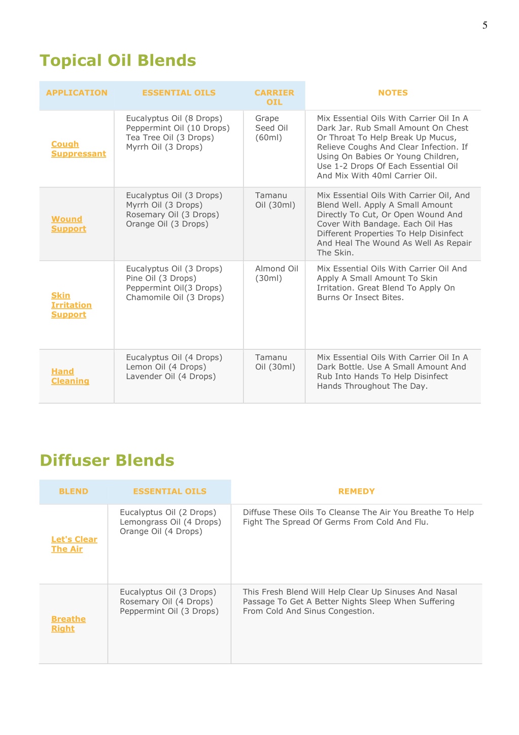 5 Topical Oil Blends APPLICATION ESSENTIAL OILS CARRIER OIL NOTES Eucalyptus Oil (8 Drops) Peppermint Oil (10 Drops) Tea Tree Oil (3 Drops) Myrrh Oil (3 Drops) Grape Seed Oil (60ml) Mix Essential Oils With Carrier Oil In A Dark Jar. Rub Small Amount On Chest Or Throat To Help Break Up Mucus, Relieve Coughs And Clear Infection. If Using On Babies Or Young Children, Use 1-2 Drops Of Each Essential Oil And Mix With 40ml Carrier Oil. Cough Suppressant Eucalyptus Oil (3 Drops) Myrrh Oil (3 Drops) Rosemary Oil (3 Drops) Orange Oil (3 Drops) Tamanu Oil (30ml) Mix Essential Oils With Carrier Oil, And Blend Well. Apply A Small Amount Directly To Cut, Or Open Wound And Cover With Bandage. Each Oil Has Different Properties To Help Disinfect And Heal The Wound As Well As Repair The Skin. Wound Support Eucalyptus Oil (3 Drops) Pine Oil (3 Drops) Peppermint Oil(3 Drops) Chamomile Oil (3 Drops) Almond Oil (30ml) Mix Essential Oils With Carrier Oil And Apply A Small Amount To Skin Irritation. Great Blend To Apply On Burns Or Insect Bites. Skin Irritation Support Eucalyptus Oil (4 Drops) Lemon Oil (4 Drops) Lavender Oil (4 Drops) Tamanu Oil (30ml) Mix Essential Oils With Carrier Oil In A Dark Bottle. Use A Small Amount And Rub Into Hands To Help Disinfect Hands Throughout The Day. Hand Cleaning Diffuser Blends BLEND ESSENTIAL OILS REMEDY Eucalyptus Oil (2 Drops) Lemongrass Oil (4 Drops) Orange Oil (4 Drops) Diffuse These Oils To Cleanse The Air You Breathe To Help Fight The Spread Of Germs From Cold And Flu. Let's Clear The Air Eucalyptus Oil (3 Drops) Rosemary Oil (4 Drops) Peppermint Oil (3 Drops) This Fresh Blend Will Help Clear Up Sinuses And Nasal Passage To Get A Better Nights Sleep When Suffering From Cold And Sinus Congestion. Breathe Right