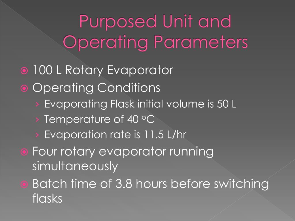 Purposed Unit and Operating Parameters • 100 L Rotary Evaporator • Operating Conditions • Evaporating Flask initial volume is 50 L • Temperature of 40 oC • Evaporation rate is 11.5 L/hr • Four rotary evaporator running simultaneously • Batch time of 3.8 hours before switching flasks