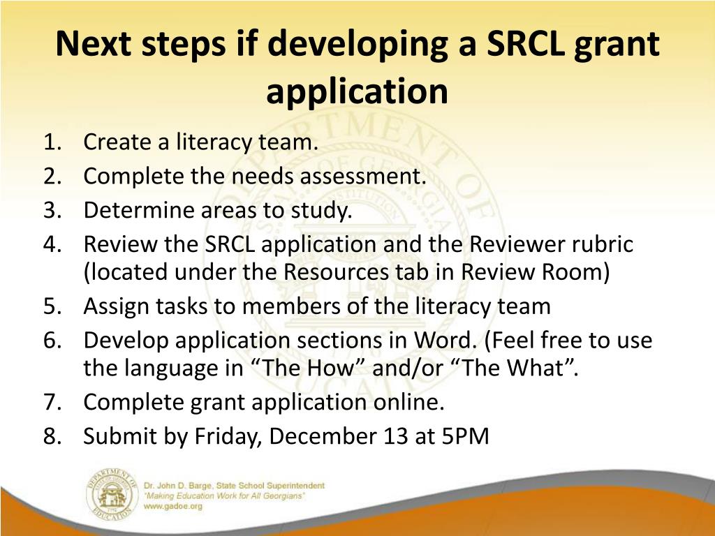 Next steps if developing a SRCL grant application • Create a literacy team. • Complete the needs assessment. • Determine areas to study. • Review the SRCL application and the Reviewer rubric (located under the Resources tab in Review Room) • Assign tasks to members of the literacy team • Develop application sections in Word. (Feel free to use the language in “The How” and/or “The What”. • Complete grant application online. • Submit by Friday, December 13 at 5PM