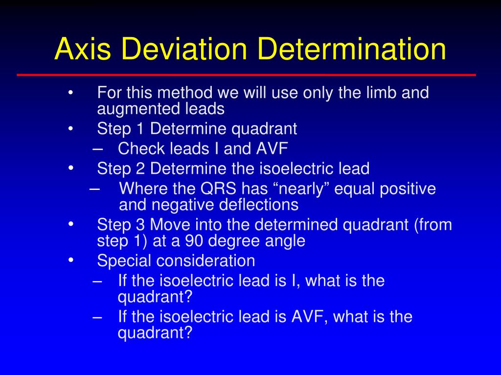 Axis Deviation Determination • For this method we will use only the limb and augmented leads • Step 1 Determine quadrant • Check leads I and AVF • Step 2 Determine the isoelectric lead • Where the QRS has “nearly” equal positive and negative deflections • Step 3 Move into the determined quadrant (from step 1) at a 90 degree angle • Special consideration • If the isoelectric lead is I, what is the quadrant? • If the isoelectric lead is AVF, what is the quadrant?