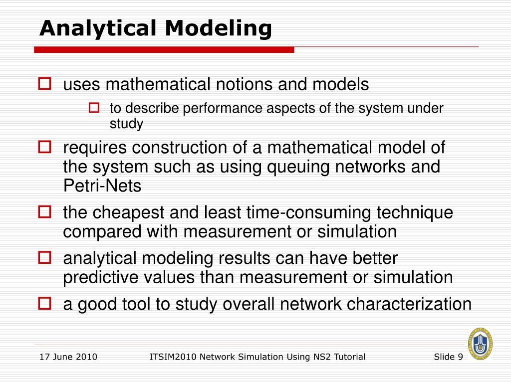 Performance Evaluation Techniques Techniques commonly used in the computer systems and networking research • Measurements • Analytical Modeling • Simulation ITSIM2010 Network Simulation Using NS2 Tutorial