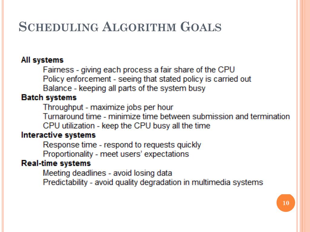 If a hardware clock provides periodic interrupts at 50 Hz, 60 Hz, etc., a scheduling decision can be made at each clock interrupt or at every k-th clock interrupt. Scheduling algorithms can be divided into two categories with respect to how they deal with clock interrupts: • A nonpreemptive scheduling algorithm picks a process to run and then just lets it run until it blocks or until it voluntarily releases the CPU. In effect, no scheduling decisions are made during clock interrupts. • In contrast, a preemptive scheduling algorithm picks a process and lets it run for limited time. If it is still running at the end of the time interval, it is suspended and the scheduler picks another process to run. In preemptive scheduling, a clock interrupt occurs at the end of the time interval and scheduler takes control of the CPU.