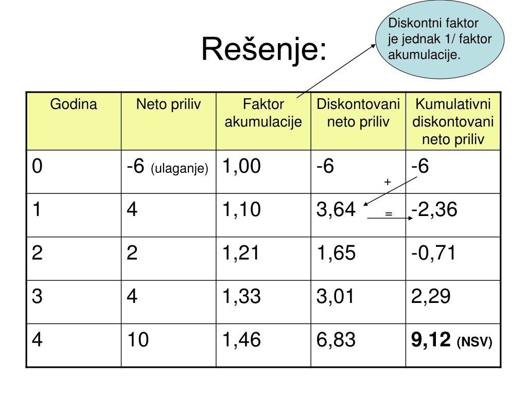 Diskontni faktor je jednak 1/ faktor akumulacije. Rešenje: + =
