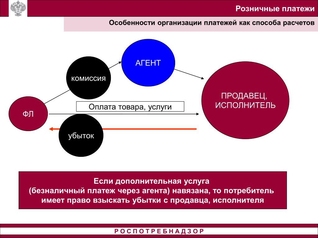 Розничные платежи Особенности организации платежей как способа расчетов АГЕНТ комиссия ПРОДАВЕЦ, ИСПОЛНИТЕЛЬ ФЛ Оплата товара, услуги убыток Если дополнительная услуга (безналичный платеж через агента) навязана, то потребитель имеет право взыскать убытки с продавца, исполнителя Р О С П О Т Р Е Б Н А Д З О Р