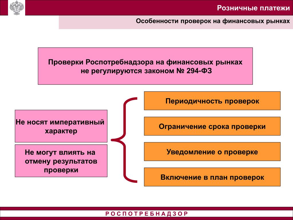 Розничные платежи Особенности проверок на финансовых рынках Проверки Роспотребнадзора на финансовых рынках не регулируются законом № 294-ФЗ Периодичность проверок Не носят императивный характер Ограничение срока проверки Уведомление о проверке Не могут влиять на отмену результатов проверки Включение в план проверок Р О С П О Т Р Е Б Н А Д З О Р