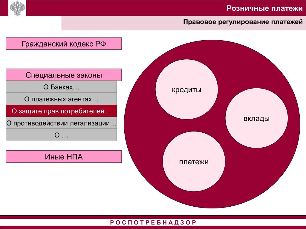 Розничные платежи Правовое регулирование платежей Гражданский кодекс РФ кредиты Специальные законы О Банках… вклады О платежных агентах… О защите прав потребителей… О противодействии легализации… О … платежи Иные НПА Р О С П О Т Р Е Б Н А Д З О Р